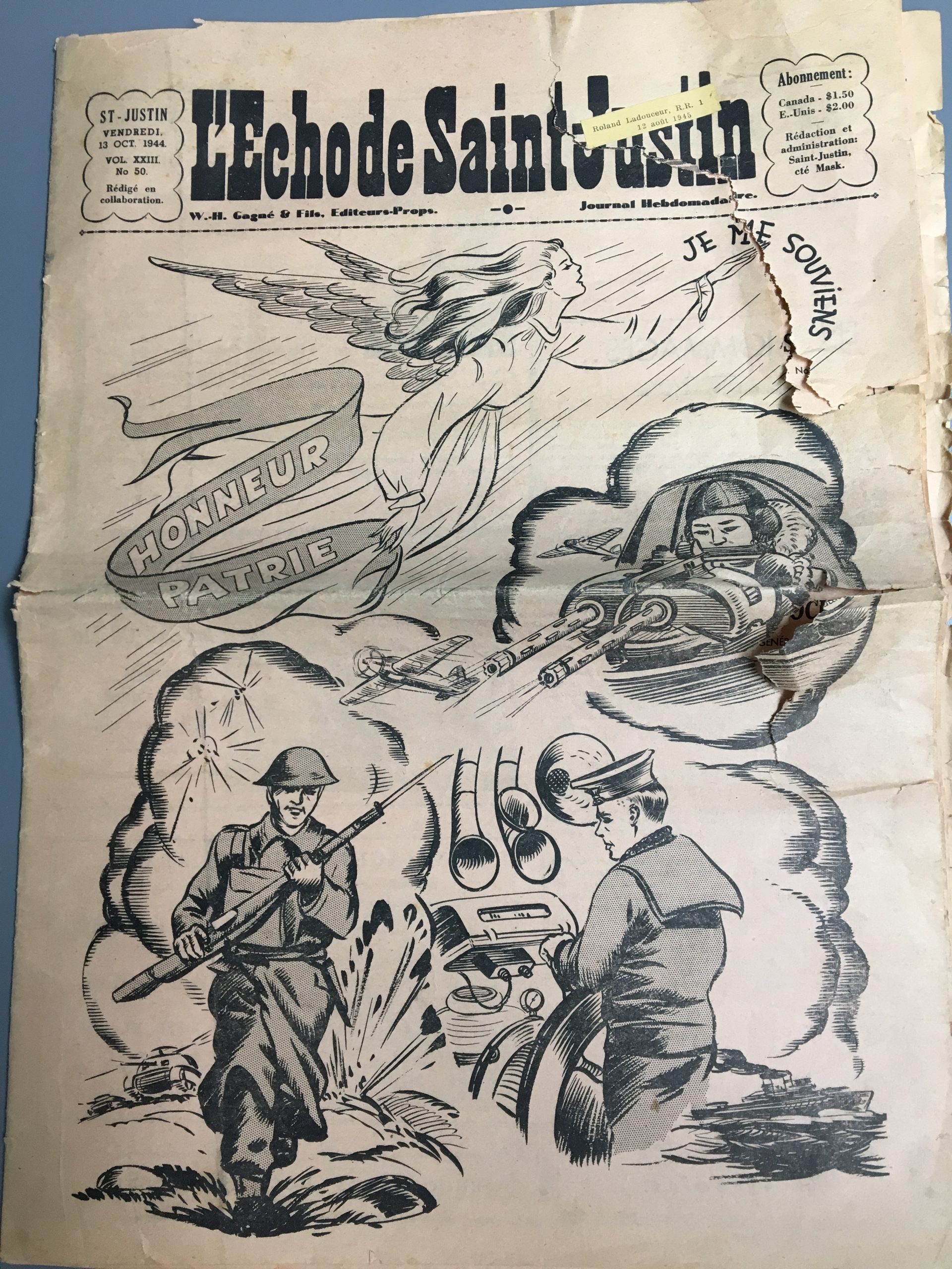 Propriété de W.-H. Gagné et fils, cet hebdomadaire, auquel étaient très attachés Béatrice et Roland Ladouceur, était le numéro 50 du volume 23. Cette édition spéciale de 16 pages visait à rendre hommage aux soldats, marins et aviateurs qui ont participé à la Seconde Guerre mondiale. Ce conflit armé s’est déroulé pendant six ans, soit du 1er septembre 1939 au 2 septembre 1945.