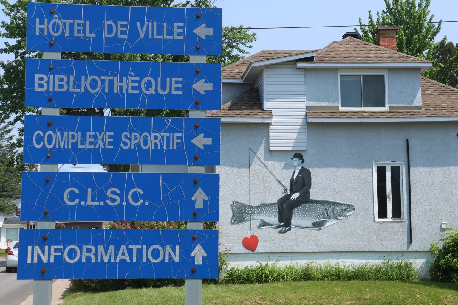 Les immenses photomontages surréalistes qui ornent les murs extérieurs de plusieurs maisons le long de la rue Notre-Dame amusent, captivent et amènent un côté ludique au village alors que Saint-Alexis-des-Monts vibre au rythme du Festival de la truite mouchetée.