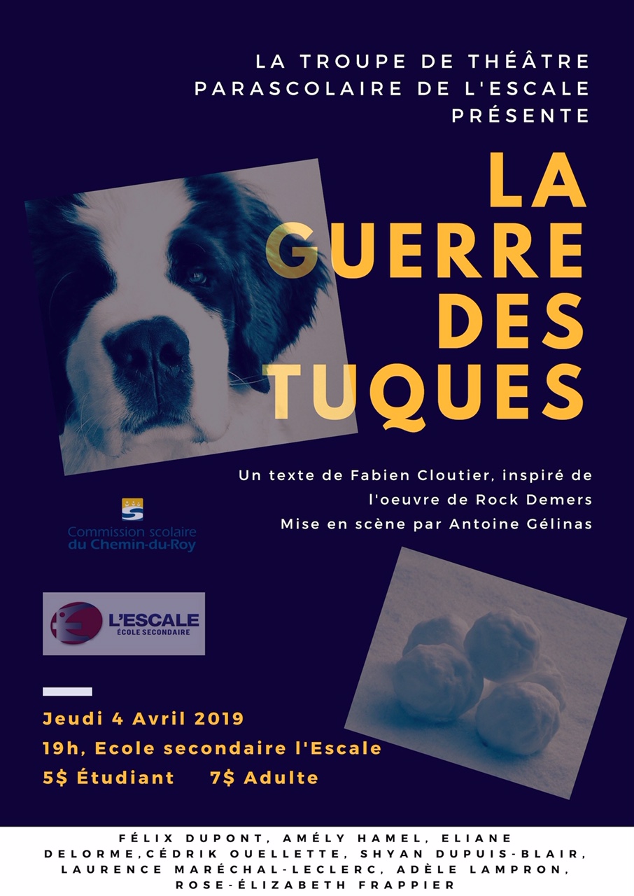 LOUISEVILLE. Les élèves de la troupe de théâtre parascolaire de l’Escale présenteront la pièce «La Guerre des tuques» de Fabien Cloutier, inspirée de l’œuvre de Rock Demers, le jeudi 4 avril à 19h à la salle Roger-Matteau de l’école secondaire l’Escale.