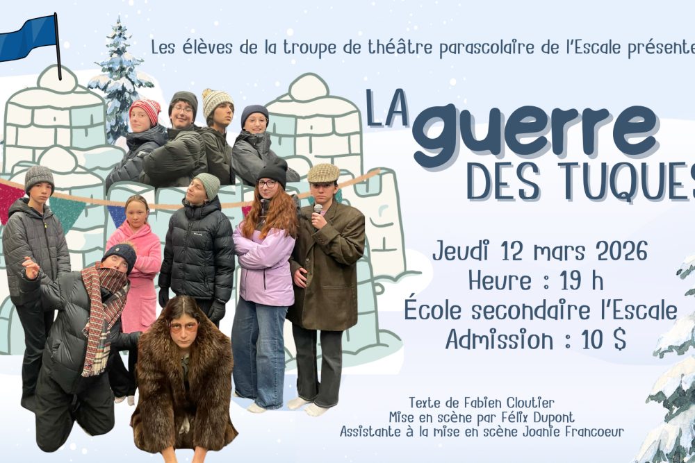 LOUISEVILLE. Les élèves de la troupe de théâtre parascolaire de l’école secondaire l’Escale de Louiseville monteront sur scène le jeudi 12 mars prochain à 19 h, à la salle Roger-Matteau, pour présenter La Guerre des Tuques, une adaptation signée Fabien Cloutier, inspirée du scénario original de Roger Cantin et Danyèle Patenaude.