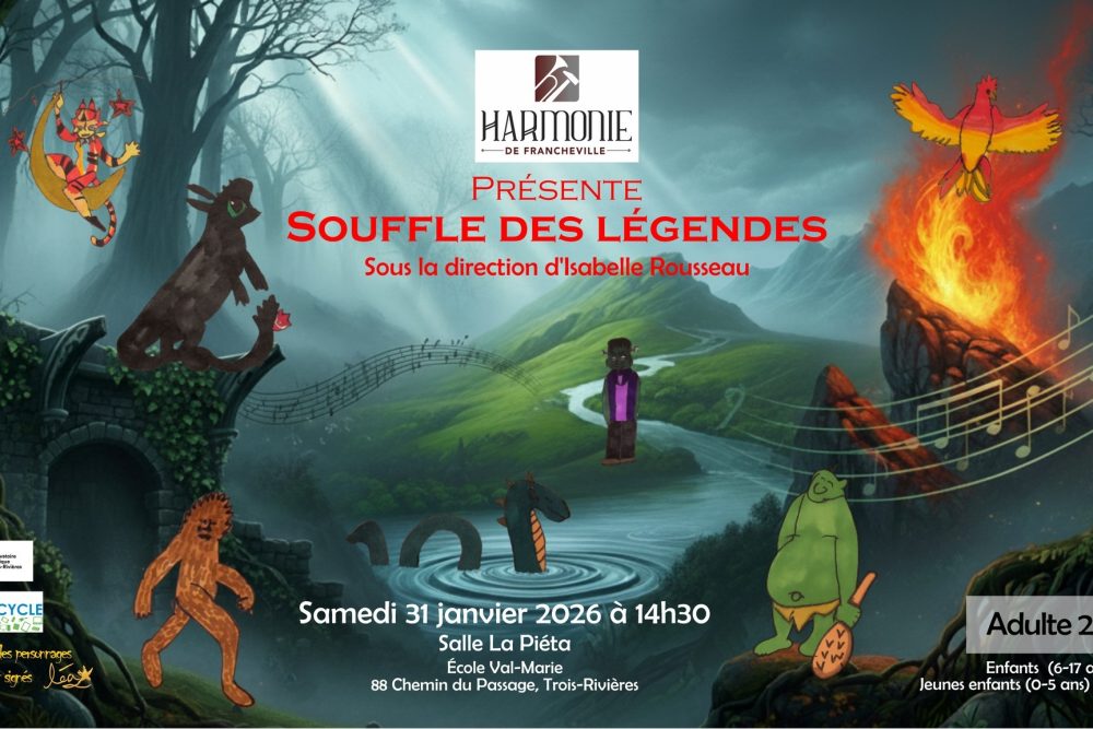 RÉGION. L’Harmonie de Francheville présentera le concert “Souffle des légendes” le 31 janvier à 14h30 à la salle La Piéta de l’école Val-Marie à Trois-Rivières. Au programme: une plongée musicale dans l’univers des mythes, des légendes et des créatures de l’imaginaire.