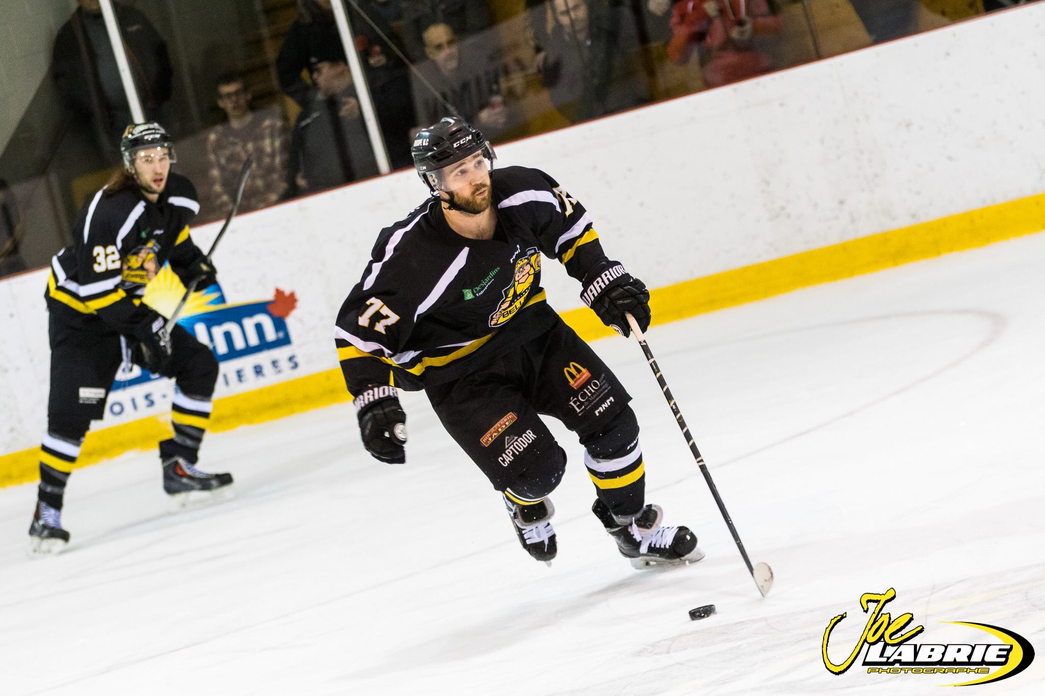 La brillante performance du gardien Philippe Gatien, jumelée à une attaque qui a profité de ses chances de marquer, a permis au <@Ri>Black and Yellow<@$p> d’enregistrer un gain de 7 à 4 devant ses partisans. Lors de ce duel, Alexis Millette (2), Alexandre Lemieux, François Godin, Antoine Desmeules, Julien Corriveau et Guillaume Morissette ont noirci la feuille de pointage du côté du Bellemare.